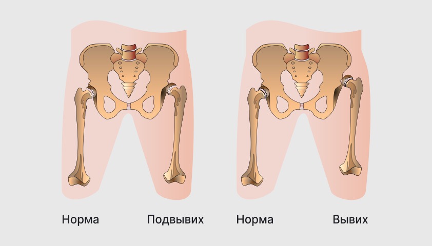 По степени нарушения развития тазобедренного сустава и смещения головки бедра различают подвывих и две степени вывиха, когда головка смещается выше, относительно вертлужной впадины.